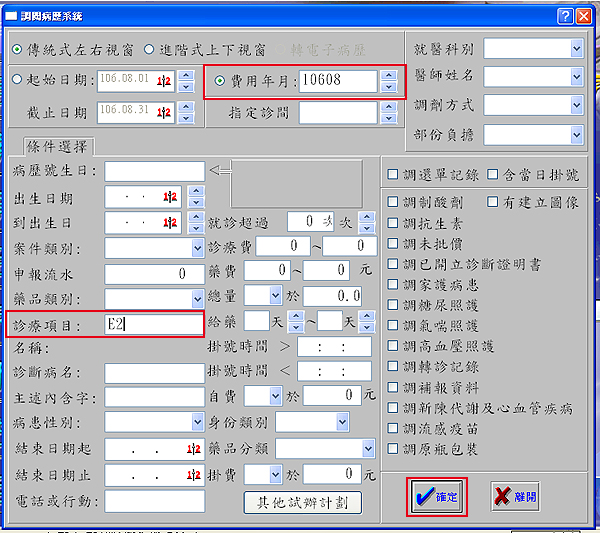 2. 於「診療項目」輸入「E2」或「EA」,再按下「確定」