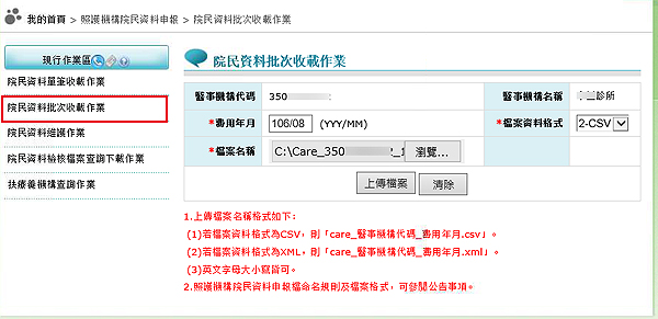 步驟二、接著再點選「院民資料批次收載作業」,於右側進行檔案上傳檢核作業