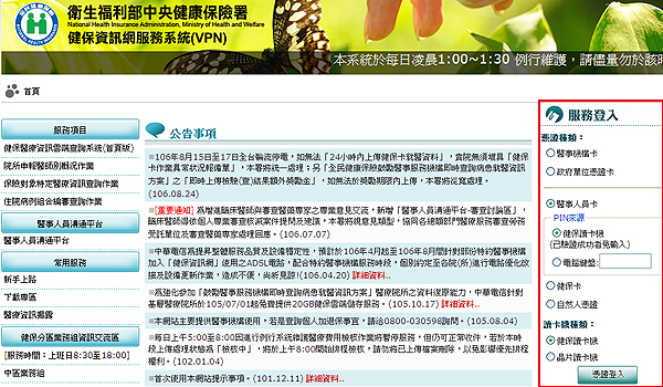 步驟一、使用醫事人員卡或健保卡憑證登入健保資訊網服務系統(VPN)