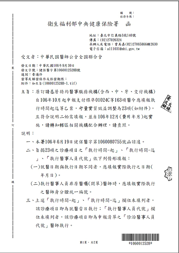 原訂請基層特約醫事服務機構(含西、中、牙、交付機構)自106年10月起申報支付標準01024C等163項醫令應填報執行時間起迄等乙案,考量實質效益調整為23項(如附件),且符合下述說明始需填報,並自106年12月(費用年月)起實施。