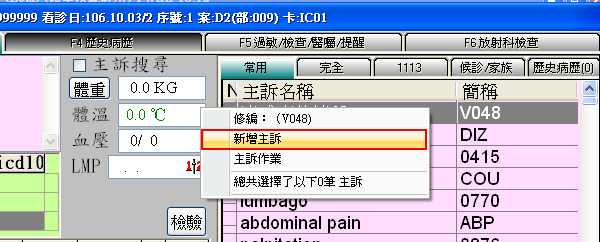 2) 游標移至右方主訴資料區,按滑鼠右鍵出現如下圖選單,再按下「新增主訴」