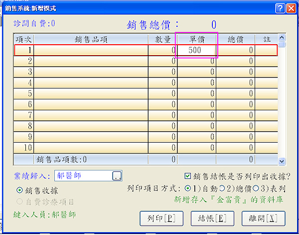 2. 於銷售系統視窗,分別鍵入「數量、單價」或者直接鍵入「單價」