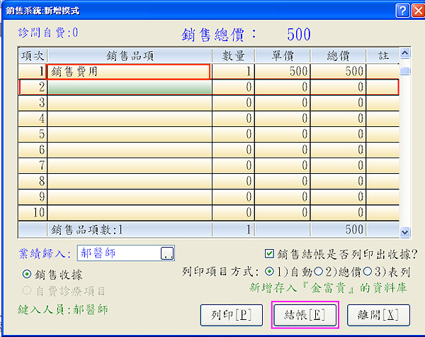 3. 銷售品項欄會自動帶出「銷售費用」文字,按下「結帳」即可