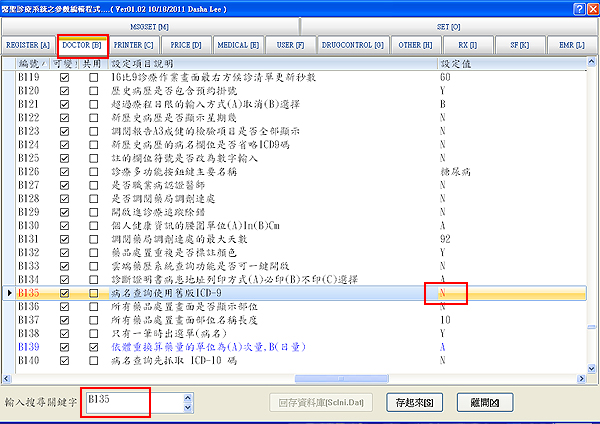 編號「B135 病名查詢使用舊版ICD-9」將右方設定值改為『N』,再按下「存起來」「離開」。