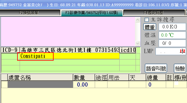 2、進入診療畫面於『ICD-9』右方中英文病名名稱顯示欄位(下圖紅框處)