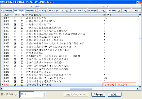 設定說明:於醫聖主畫面『S系統工具>A系統參數設定』或於『B院所資料』右下方點選『其他參數[O]』開啟參數編輯系統,於上方點選參數標籤「Doctor [B]」於下方尋找編號「B050 診斷證明書的抬頭名稱」將右方設定值改為『診斷證明書,病歷摘要,就醫證明』(註:抬頭名稱文字可自定,最多設定三個),再按下「存起來」「離開」即可。