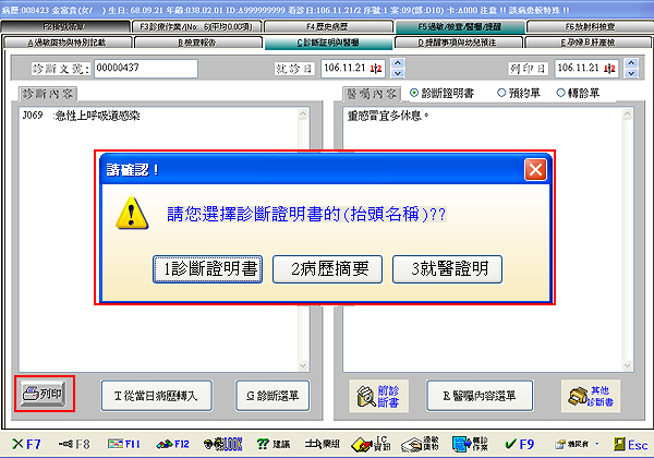 在『F3診療作業』畫面切換至『F5過敏/檢查/醫囑/提醒』頁籤底下『C診斷證明與醫屬』列印『診斷證明書』時,會出現列印選擇的項目,請視病患需求點選列印即可。