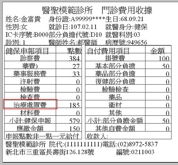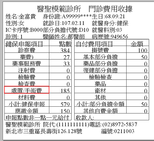 診所列印衛署收據時,其中一項名稱為『處置手術費』,本意為醫療院所若有執行治療處置或手術項目時(依健保署公告支付標準給付項目屬處置或手術章節項目)申請點數即列於該項目,但因常有民眾表示未在診所執行手術為何處置手術費項目會有申請點數,為避免引起誤會開放本欄位供院所自行修定文字。