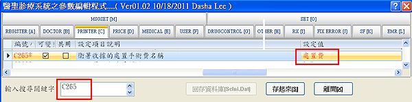 2、於畫面左下方「輸入搜尋關鍵字」欄內輸入參數編號『C265』按下ENTER鍵跳至該編號列上,將「衛署收據的處置手術費名稱」右方設定值自行輸入『文字名稱』,預設值為『處置/手術費』,再按下「存起來」「離開」即可。