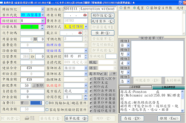 診療作業操作方式不變,批價存檔畫面,「給付類別」會自動跳8(天然災害),如下圖示