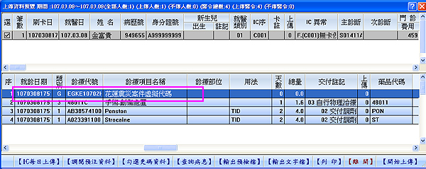每日上傳及xml申報格式會自動帶入花蓮震災補助案件虛擬醫令代碼「EGKE10702HUA」,如下圖示