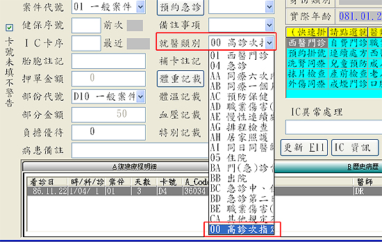 【醫聖系統請於刷卡掛號時,於就醫類別處自行點選「00 高診次」即可。注意!此欄位無特殊需求,請勿任意點選,以免IC上傳檢核錯。】