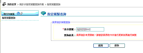 左方點選「指定就醫查詢」,右方請輸入掛號時,出現「9129」異常代碼民眾的身分證號