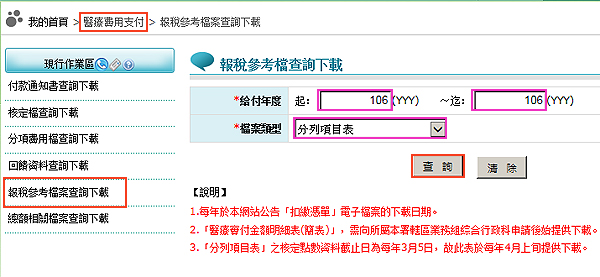 『給付年度』﹙例如:106~106﹚/『檔案類型』﹙例如:分列項目表﹚