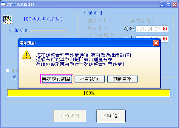 請按下『再次執行調整』(同9申報作業第3項調整門診合理量功能)