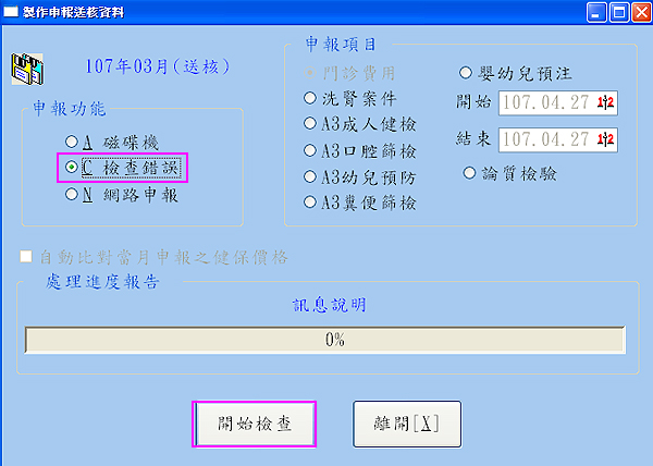 1. 於「9申報作業」第4項『製作申報磁片』「C檢查錯誤」執行「開始檢查」