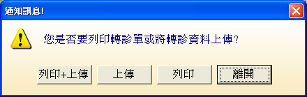 會出現如下圖視窗,詢問是否要列印轉診單且一併上傳,請診所依需求點選