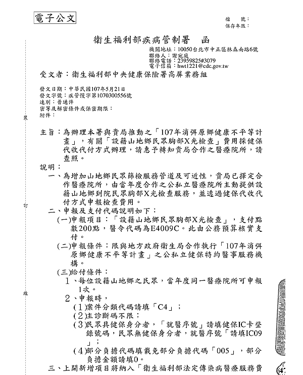 為推動「107年消弭原鄉建康不平等計畫」有關「設籍山地鄉民眾胸部X光檢查」費用採健保代收代付方式辦理