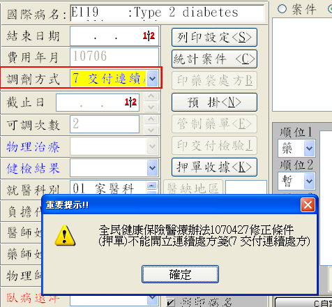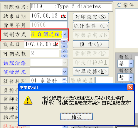 若「調劑方式」點選「自調連續處方」或「交調連續處方」時會出現如下圖提醒