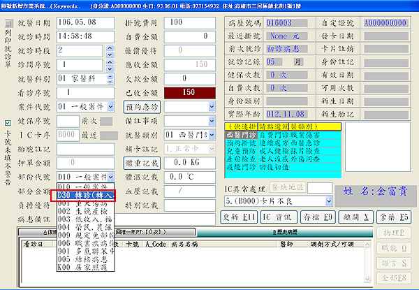 執行「IC卡掛號」,於掛號編輯畫面的「部份代號」下拉式選單改選「D30」,再按下「存檔」