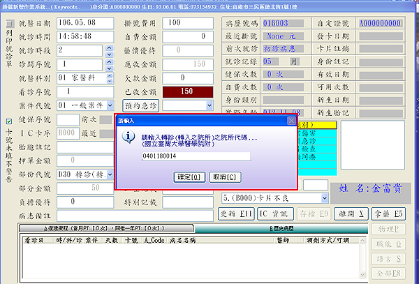 出現如下圖「請輸入轉診之院所代碼」視窗,輸入他院轉入之院所機構代碼,再按下「確定」