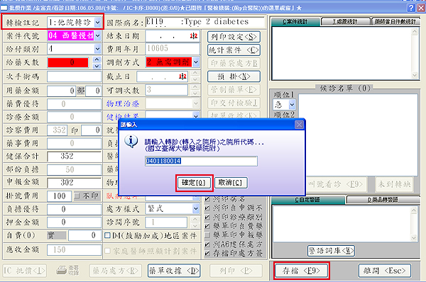3. 於批價作業畫面,按下「存檔」後會出現「請輸入轉診院所代號」視窗,