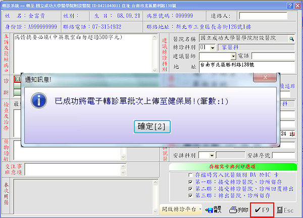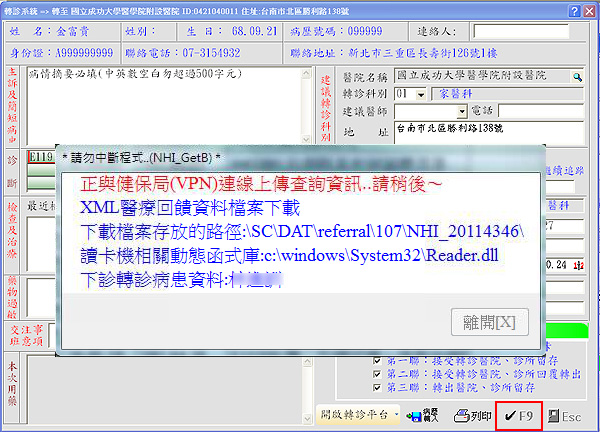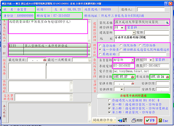 2. 於『轉診系統』,病情摘要、主診斷、轉入院所、轉入科別為必填欄位,務必填寫完整再按下「vF9」