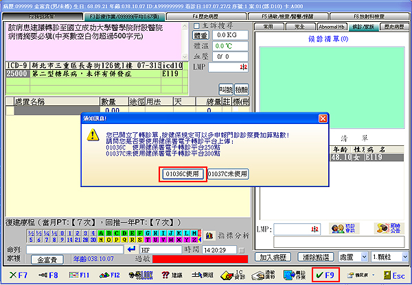 系統會跳出轉診醫令代碼選擇視窗,按下「01036C使用」,再按下「vF9」進入批價作業畫面