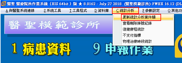 於醫聖門診系統主畫面上方工具列,執行『C統計分析』>『更新統計分析案件類』