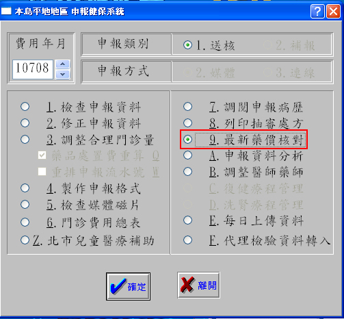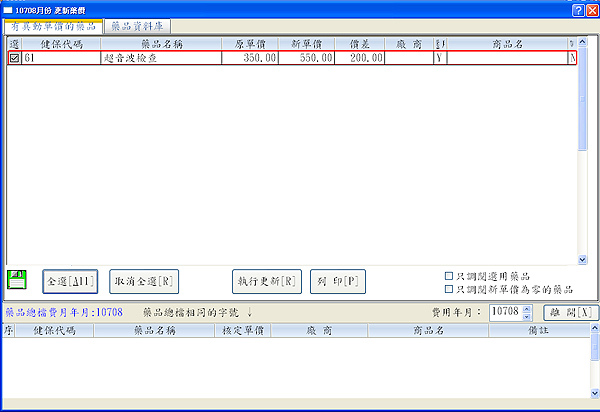 更新完成後,於『9申報作業』第9項「最新藥價核對」,如下圖顯示畫面可查看異動資料
