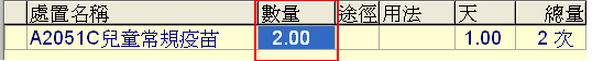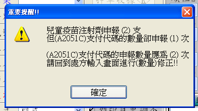 批價作業畫面存檔時,系統會檢核公費疫苗劑次與接種處置費數量是否一致,