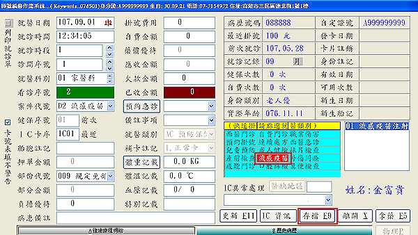 用滑鼠點選快速掛號選單內的『老人流感』或『流感疫苗』,再按下『F9存檔』即可。