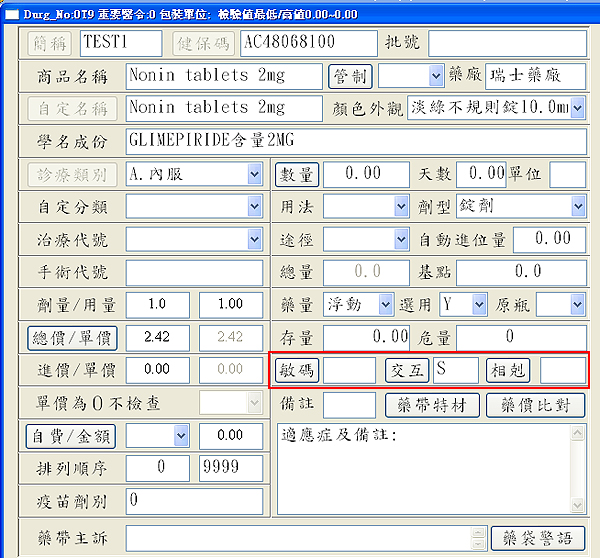 1. 於『4藥品資料』,將簡稱TEST1與TEST2藥品於「交互」欄填入同一個代碼「S」後存檔。