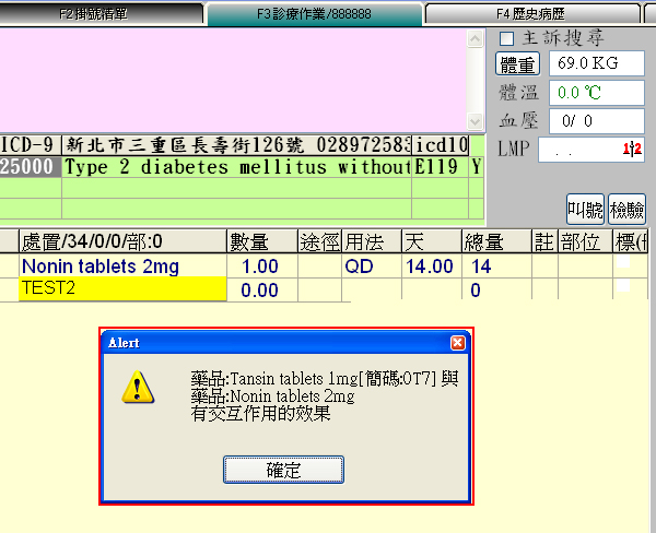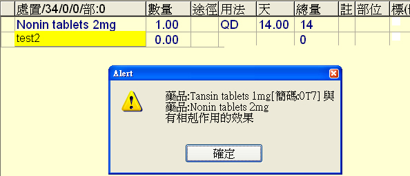 2. 於『F3診療作業』先鍵入簡稱TEST1藥品後,再鍵入簡稱TEST2藥品時,即會出現如下警示視窗。