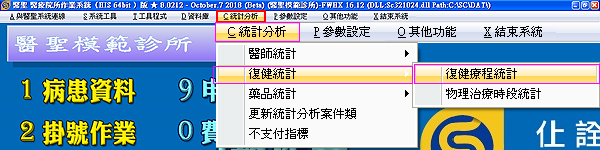 1-1. 於醫聖主畫面點選系統工具列「C 統計分析>復健統計>復健療程統計」進入