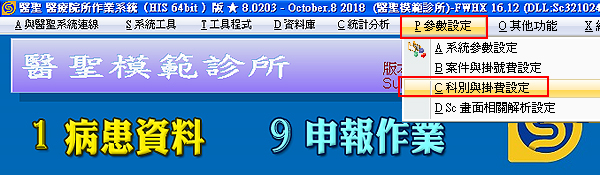 1. 於醫聖系統主選單「P參數設定」下方選單,點選「科別與掛費設定」(如下圖所示)