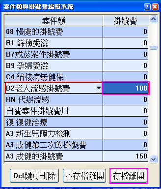 於D2案件類右方掛號費欄輸入要收取的金額後,再按下「存檔離開」即可。