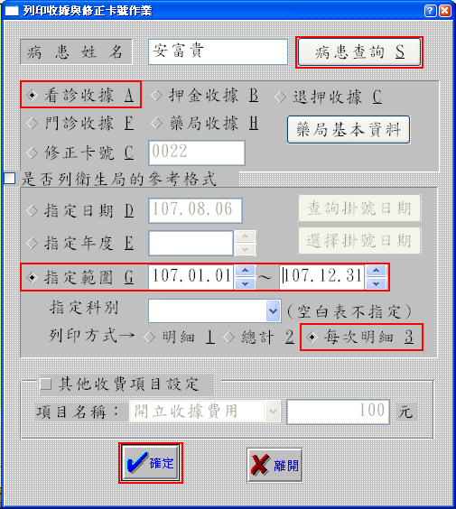 如何列印病患某段期間內看診收據每次明細