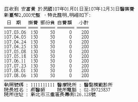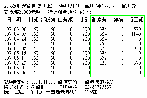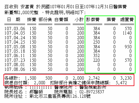 預設直接印出診察費/藥費/處置費(下圖綠框處)及加總申請費用(下圖紅框處)明細
