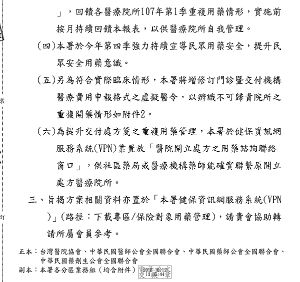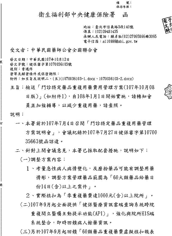 檢送「門診特定藥品重複用藥費用管理方案」自108年1月1日開始實施