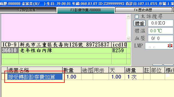 於「F3診療作業」處置內容鍵入申報「01038C」接受轉診門診診察費加算代碼,再按下「vF9」