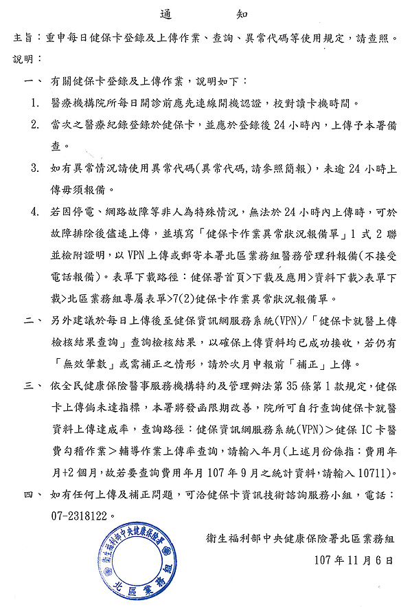 重申每日健保卡登錄及上傳作業、查詢、異常代碼等使用規定