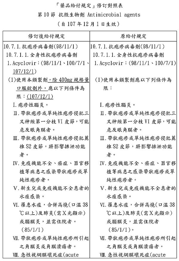 公告事項:修訂「全民健康保險藥物給付項目及支付標準-第六編第八十三條之藥品給付規定第10節 抗微生物劑 Antimicrobial agents 10.7.1.1.全身性抗疱疹病毒劑」部分規定(附件電子檔已置於本署全球資訊網(http://www.nhi.gov.tw),路徑為:首頁>公告,請自行下載)。