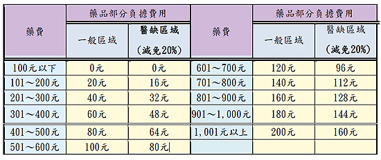 民眾到診所或醫院看病時,除了全民健保支付的醫療費用之外,自己也要負擔一部分的金額,也就是所謂的「部分負擔」。而一般看門診,民眾需要支付的費用,包括門診(或急診)基本部分負擔、門診藥品部分負擔等。從民國102年開始,民眾只要到全民健康保險醫療資源缺乏地區的醫療院所就診,門診(或急診)基本部分負擔、門診藥品部分負擔、復健部分負擔、居家照護部分負擔的費用就可減免20%。