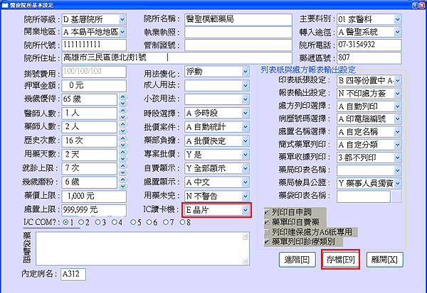 於『B 院所資料』下方「IC讀卡機」選擇「E 晶片」;「I/C COM?」點選「1」;再按下「存檔」。