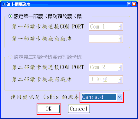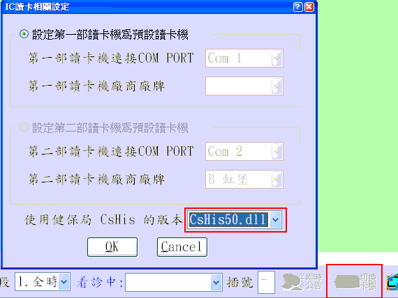 1. 若曾使用醫聖『切換卡機』功能設定為『CsHis50.dll』,請改回『CsHis.dll』再按下『OK』。