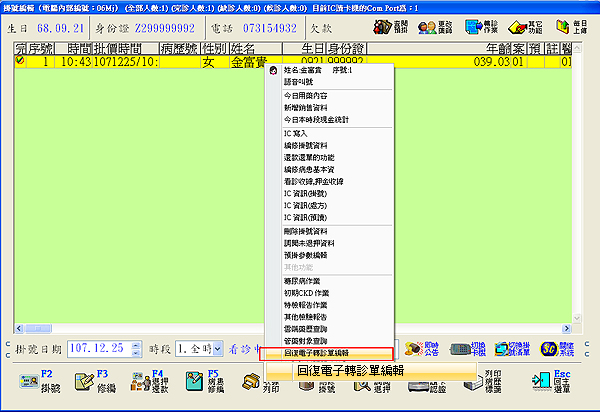 ● 於掛號作業的掛號清單,反黃列上按滑鼠右鍵亦可開啟『回復電子轉診單編輯』進行登打上傳