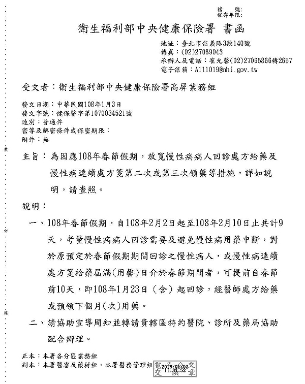 108年春節假期放寬慢性病病人回診處方給藥及慢箋領藥措施說明