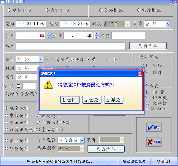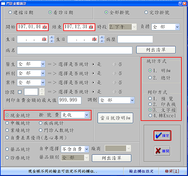 1. 請選擇要統計開始、結束日期,於下方『現金統計』右側掛號費選『免收』