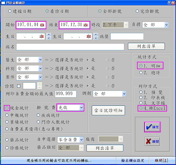 1. 請選擇要統計開始、結束日期,於下方『現金統計』右側掛號費選『免收』